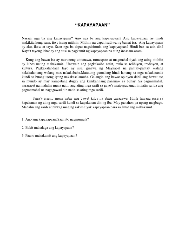 Ang kapayapaan ay isang konsepto ng pagkakaibigan sa lipunan at pagkakaisa sa kawalan ng poot at karahasan. 3 question Bakit mahalagang pairalin ang kapayapaan sa mundo. Kahalagahan ng kapayapaan sa mundo.